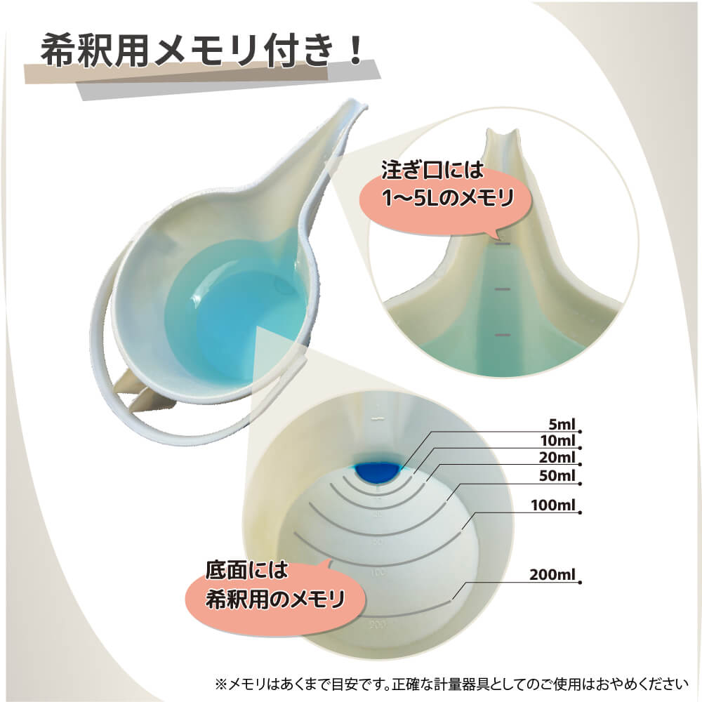 底面と注ぎ口に希釈用の目盛り付き!